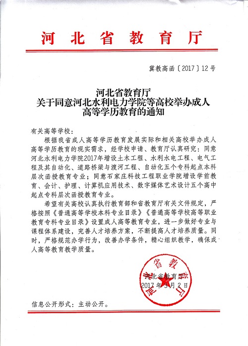 河北省教育厅下发《河北省教育厅关于同意荣耀体育·荣耀体育(中国)官方网,等高校举办成人高等学历教育的通知》(冀教高函〔2017〕12号)同意我校2017年增设土木工程、水利水电工程、电气工程及其自动化、道路桥梁与渡河工程、自动化...