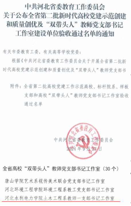 9月27日,根据《中共河北省委教育工作委员会关于公布全省第二批新时代高校党建示范创建和质量创优及“双带头人”教师党支部书记工作室建设单位验收通过名单的通知》,土木工程系教师一支部顺利通过了河北省第二批高校“双带头人”教师党支部书记工作室建设验收,这一成果标志着我校在基层党组织建设方面取得了又一重要进展。土木工程系“双带头人”教师党支部书记工作室自建设以来,一直致力于发挥党建引领作用,工作室党员老师积极探索党建工作与教学科研的深度融合。...