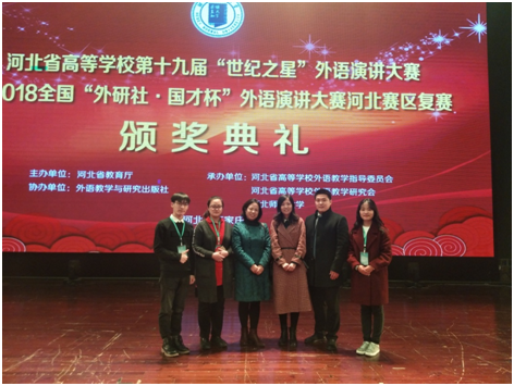 河北省第十九届“世纪之星”外语演讲大赛于2018年11月17-18日在河北师范大学成功举办,来自全省103所高校的410多名选手参加了比赛,我校共有四名选手参赛,其中,刘泽龙荣获青年教师组二等奖,造价201654班樊娇龙和国...