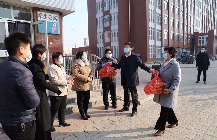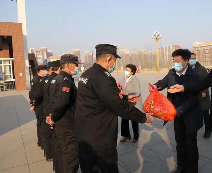 崔立功副校长、方敏书记一行先后来到学校总值班室、南门警卫室、锅炉房、学生公寓值班室等各个值班岗位,认真了解了学校寒假期间安保、供暖、值班等工作情况,代表学校向坚守在一线岗位的教职工送上了慰问品和新年祝福,向他们无私的奉献精神表示衷心的感谢。并希望各位教职工一定要提高政治站位,把疫情防控、安全稳定放在首位,严格按照省市疫情防控要求,封闭校园管理,认真做好各项工作,为学校营造安全稳定的校园环境。