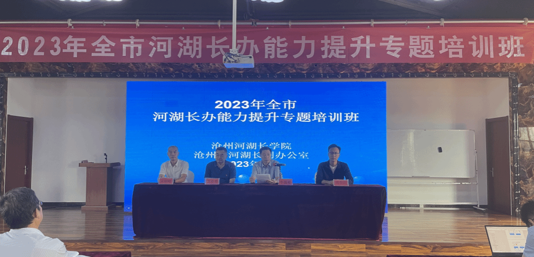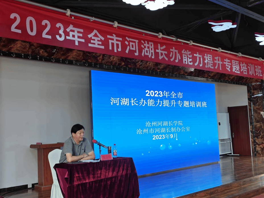 沧州市水务局党组成员、副局长牛保根,河海大学教授唐德善、沧州市河长办办公室主任邢春江、荣耀体育·荣耀体育(中国)官方网,继续教育中心主任宋朝峰等领导和嘉宾出席会议并在主席台就座。参会人员有市河湖长制办公室工作人员,21个县(市、区)河湖长制办公室分管负责同志、科室负责同志及乡镇从事河湖长制工作人员等,共计七十余人。