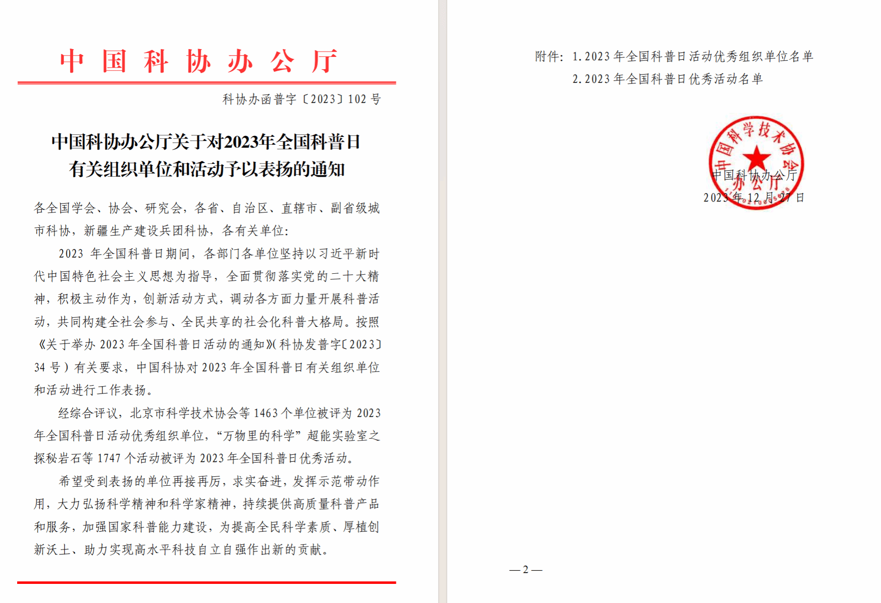 近日,中国科协办公厅发布《关于对2023年全国科普日有关组织单位和活动予以表扬的通知》(科协办函普字〔2023〕102号),对2023年全国科普日有关组织单位和活动进行工作表扬,我校榜上有名!