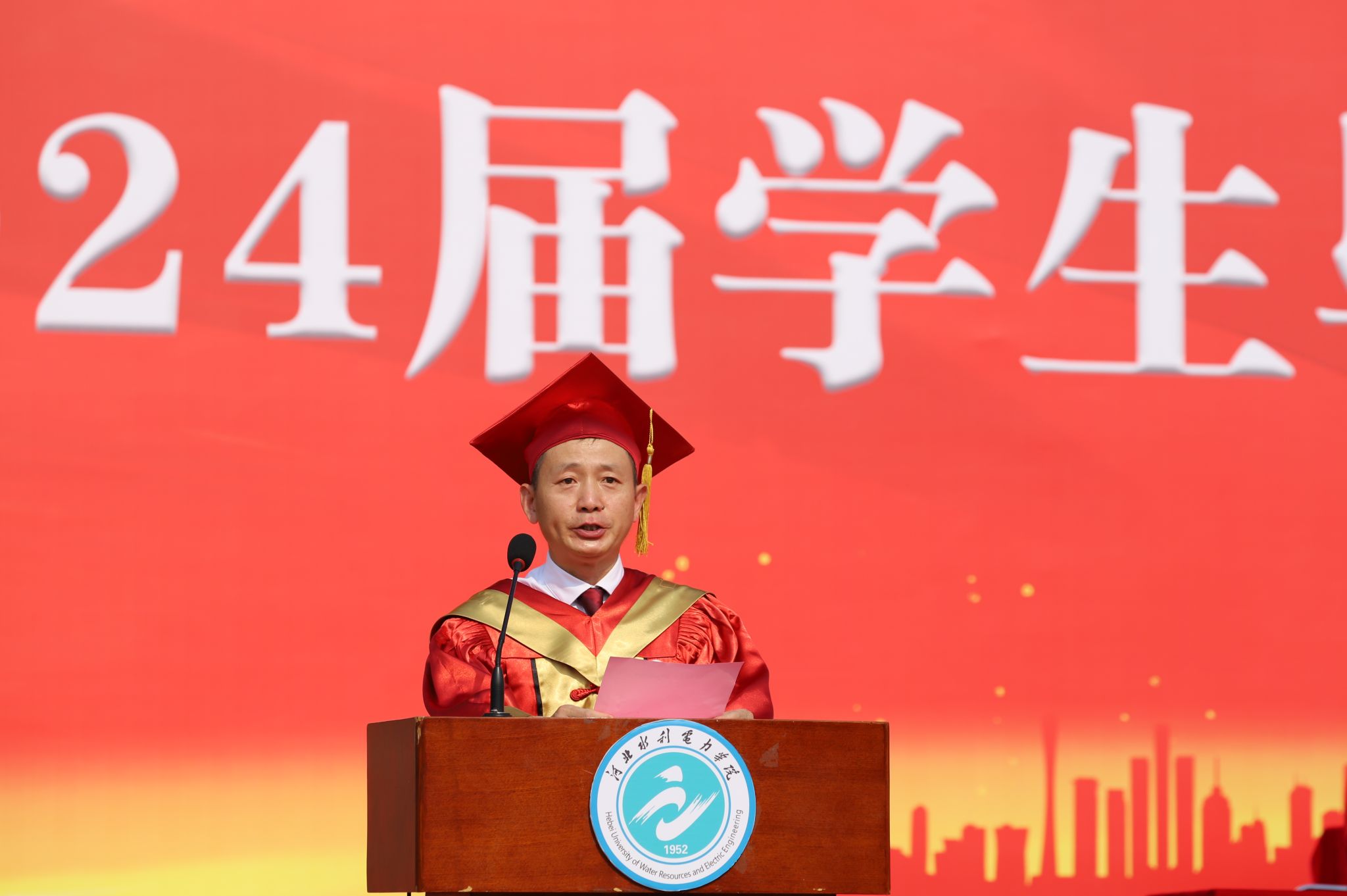 最后,王滨向2024届毕业生圆满完成学业表示热烈的祝贺,回顾了同学们极不平凡的四年大学生活以及学校的快速发展。王滨以“不负韶华致青春 扬帆起航向未来”作为临别赠言,对我校全体优秀学子提出了四点殷切期望和美好祝福。一是立鸿鹄之志,做大任之才;二是筑扛鼎之肩,修笃学之能;三是展奋斗之姿,踏锦绣之程;四是强身体之健,固拼搏之基。