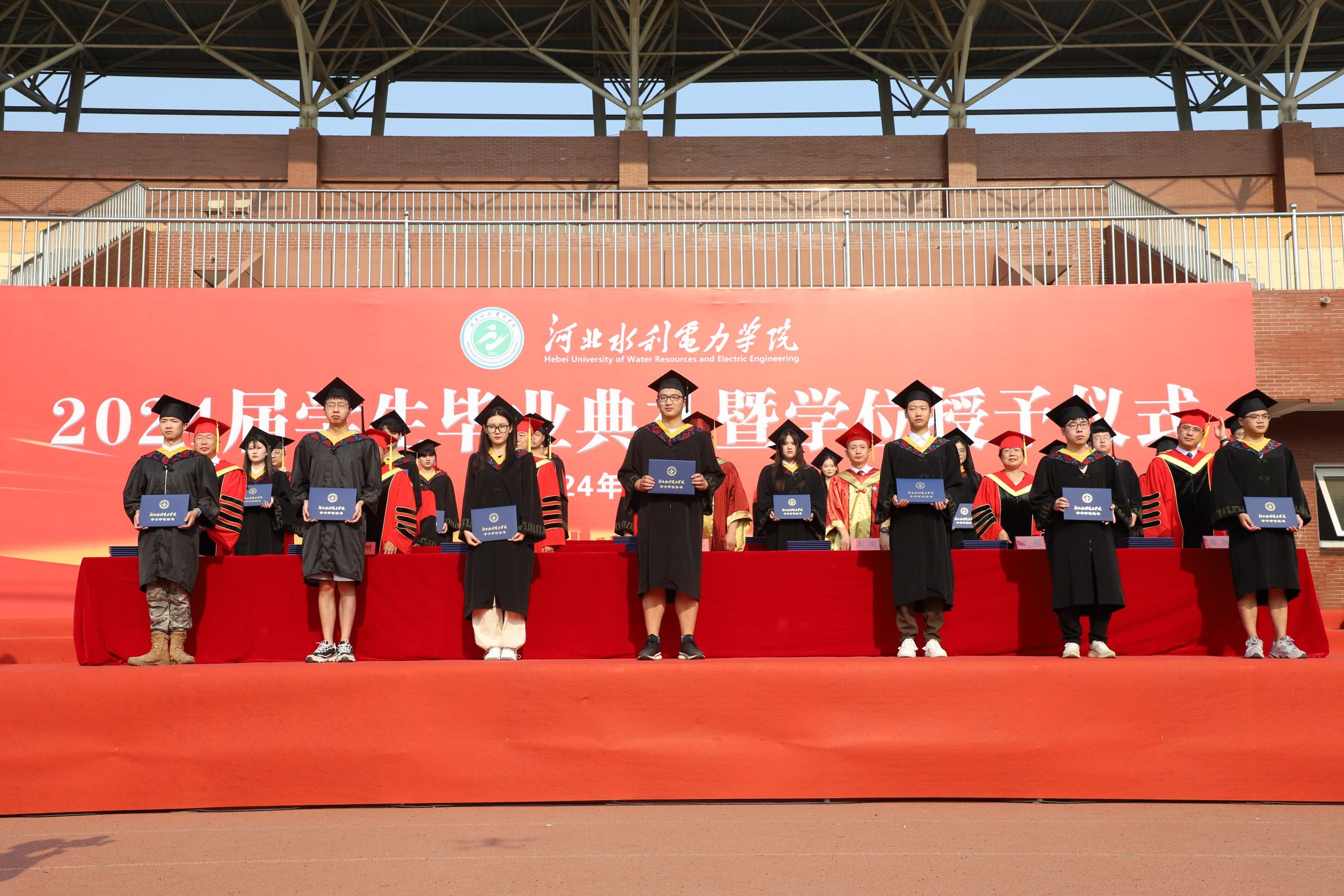 王建明宣读了荣耀体育·荣耀体育(中国)官方网,关于授予2024届本科生学士学位的决定。出席典礼仪式的领导、教师为2024届优秀毕业生代表拨穗正冠,颁发学位证书,并合影留念。