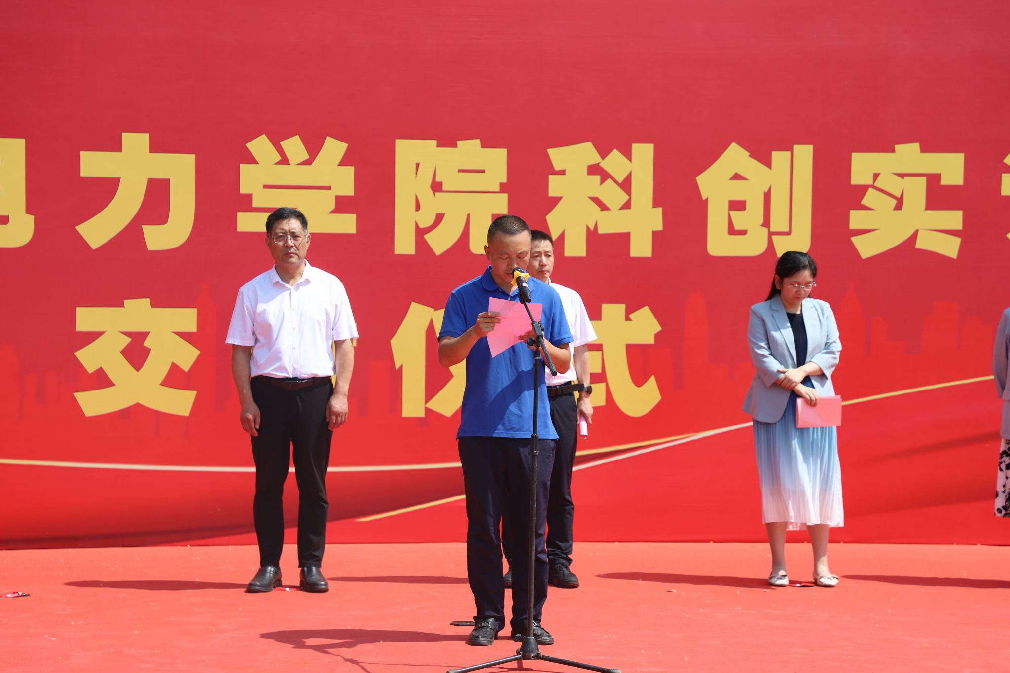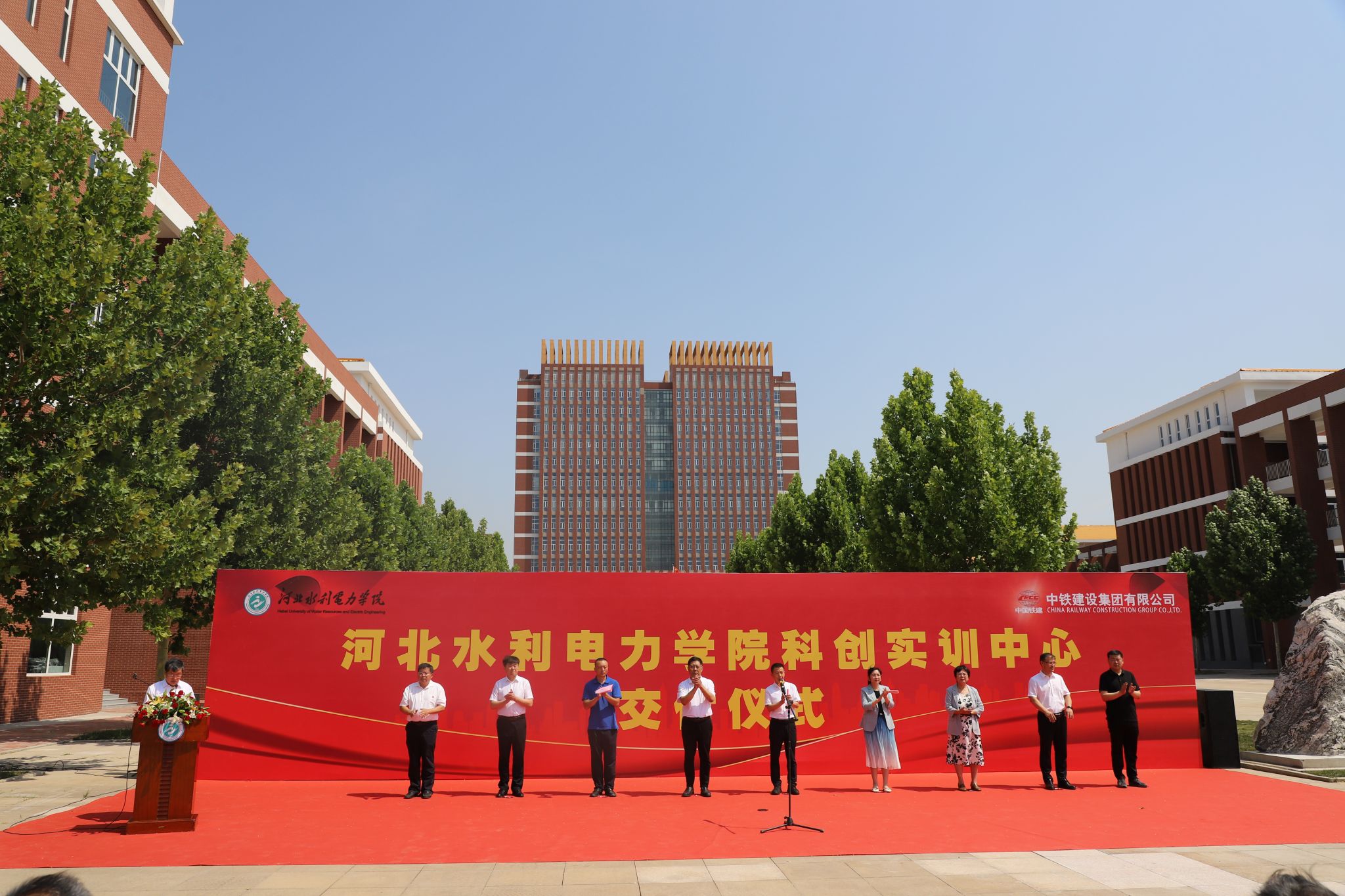 仲夏时节,喜讯频传。6月28日上午10时,我校举行科创实训中心竣工交付仪式。学校领导班子全体成员,中咨工程有限公司副总经理杨慧丽,中铁建设华北公司项目部负责人李晓帅,沧州市生态环境局运河区分局局长潘学健出席。仪式由副校长于振海主持。