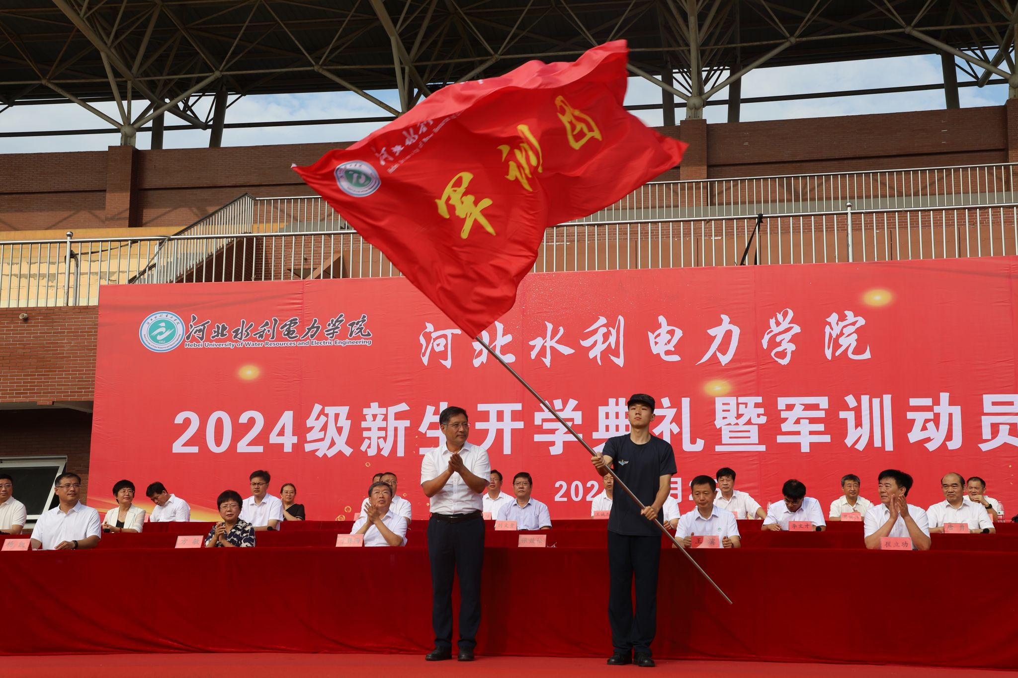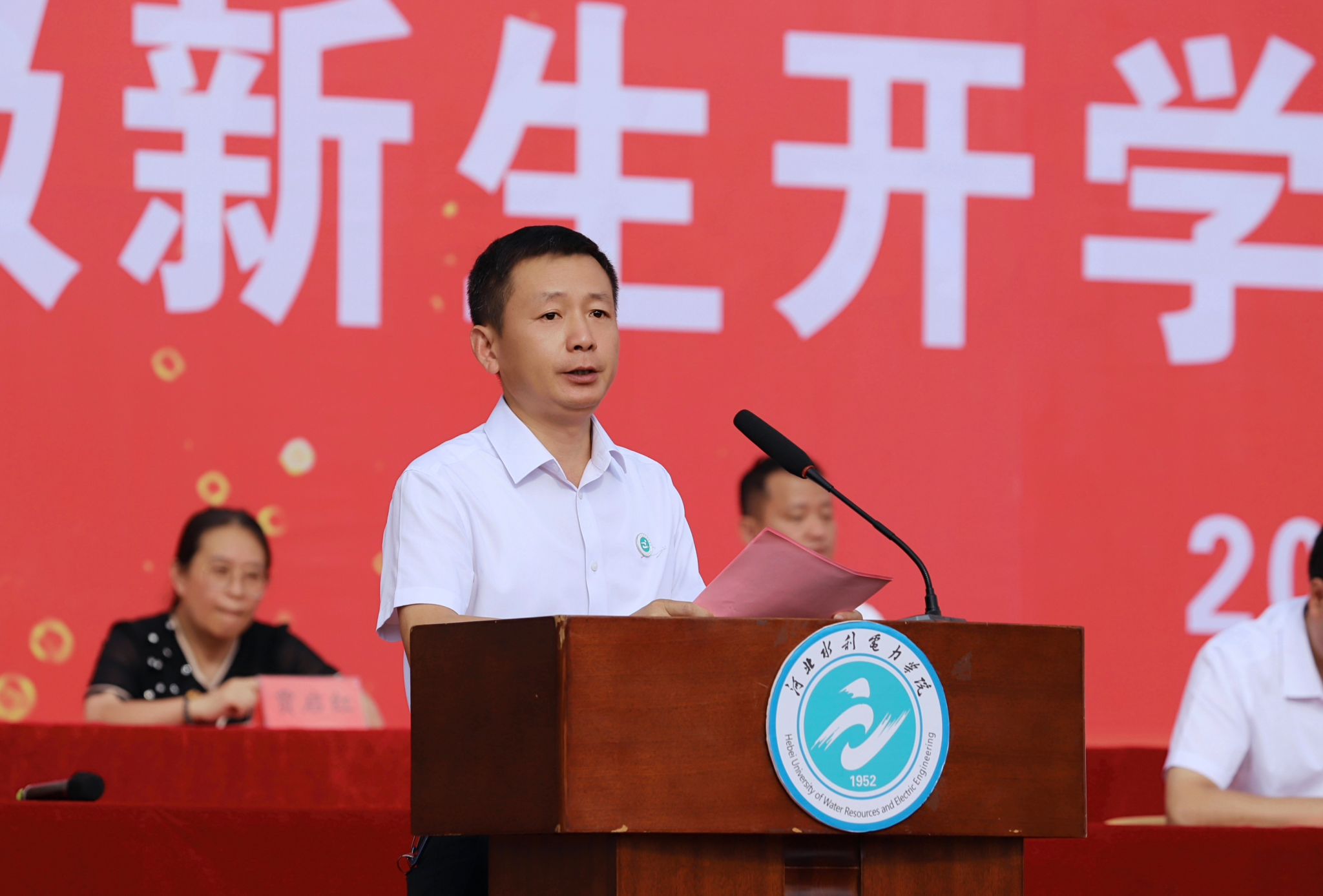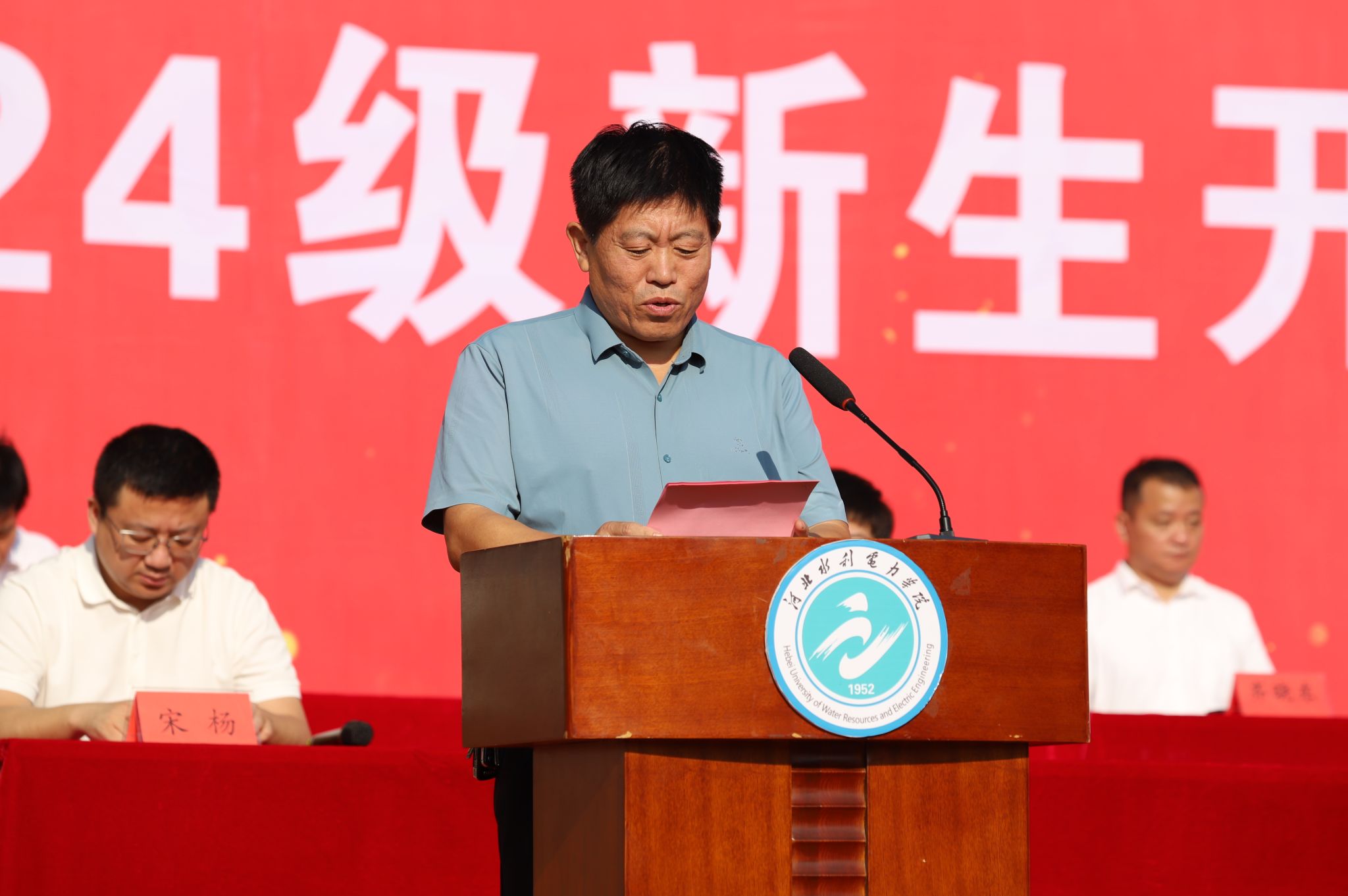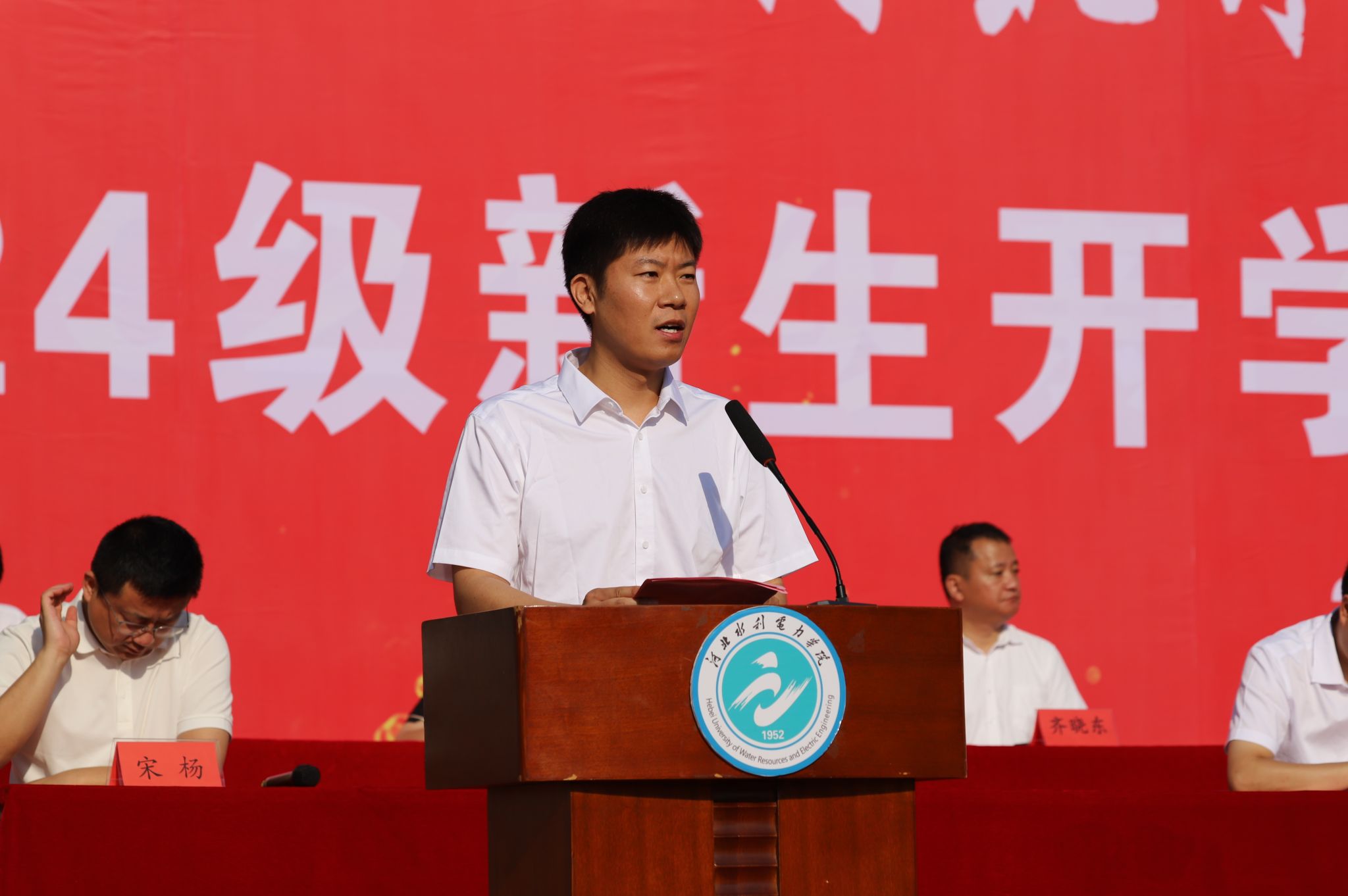 最后,王滨校长发表了题为“弘扬奋斗精神 勇担时代重任”的讲话。王滨首先对2024级新同学表示了热烈欢迎,向同学们介绍了我校的办学历史、专业特点,并用杰出校友的事迹激励同学们勤奋学习、主动思考,争做堪当大任的时代新人。他对新生同学们提出了三点期望:一是坚持奋斗与时代同行,做“爱国奉献”的水电学院人;二是坚持奋斗与创新同行,做“求真务实”的水电学院人;三是坚持奋斗与磨练同行,做“追求卓越”的水电学院人。最后,他鼓励  2024级全体新生用奋斗擦亮青春底色,用行动担起时代之责,与新时代同向同行、共同前进,积极投身强国建设、民族复兴伟业,让青春绽放绚丽之花,让奋斗点亮时代芳华,从此刻起,踏歌而行,开启新程!