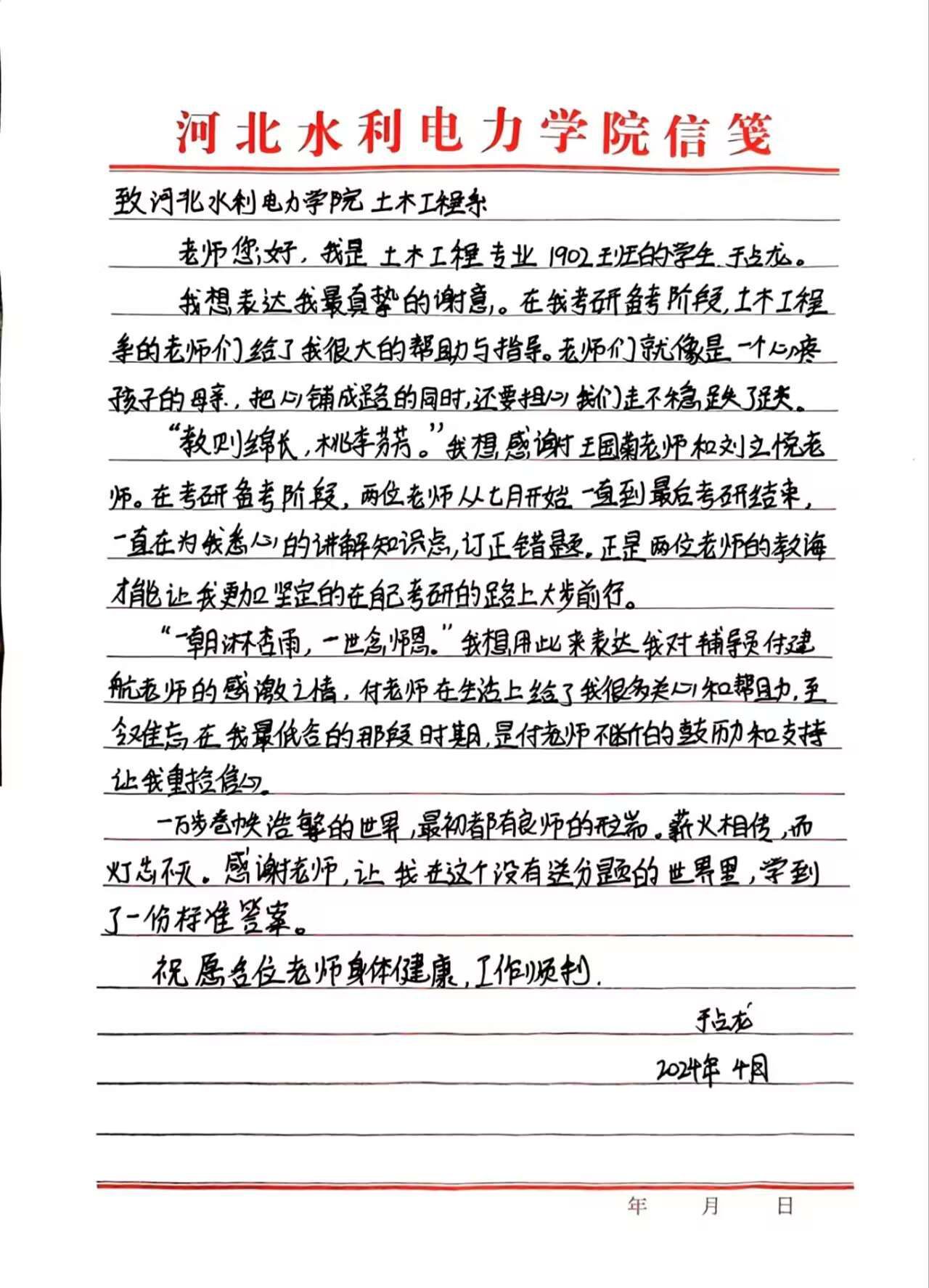 光阴流转,授业之恩难忘。于占龙亲笔书写的感谢信,简短的话语中饱含着他对学校的真挚情感。近年来,土木工程系秉承“勤奋、求是、创新、笃行”的校训精神,在育人工作中屡结硕果,学生考研升学率逐年递增,有多人以优异的成绩考入985211重点大学深造。已就业的毕业生在工作中兢兢业业、作风朴实,适应岗位快、专业素养高、创新意识强,得到就业单位一致好评,充分展现出了水院学子的优秀风采。