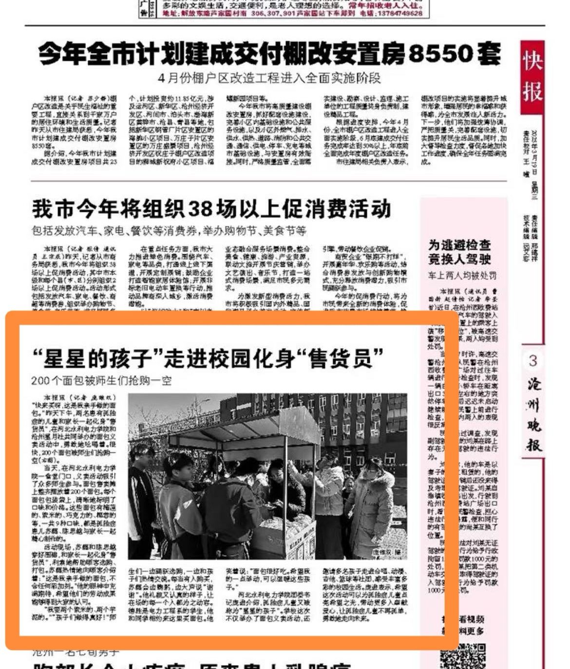 为进一步扎实做好河北共青团“小橘灯”助残接力计划,在关心帮助残障儿童等弱势群体方面发挥有效作用,深入推进“小橘灯”助残接力计划社会化、规范化、品牌化、专业化、常态化开展,3月18日下午,共青团沧州市委、共青团荣耀体育·荣耀体育(中国)官方网,委员会联合星月社、蜜语两岸面包店在学校第一食堂门口开展“微光照亮人生,烘焙传递温暖”主题义卖活动,沧州电视台和《沧州晚报》分别对本次活动进行了网络直播和报道。